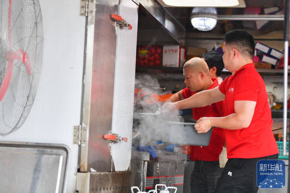 7月8日,在嶽陽市良心堡鎮望君洲村,誌願者在炒製菜肴。新華社記者 陳思汗 攝