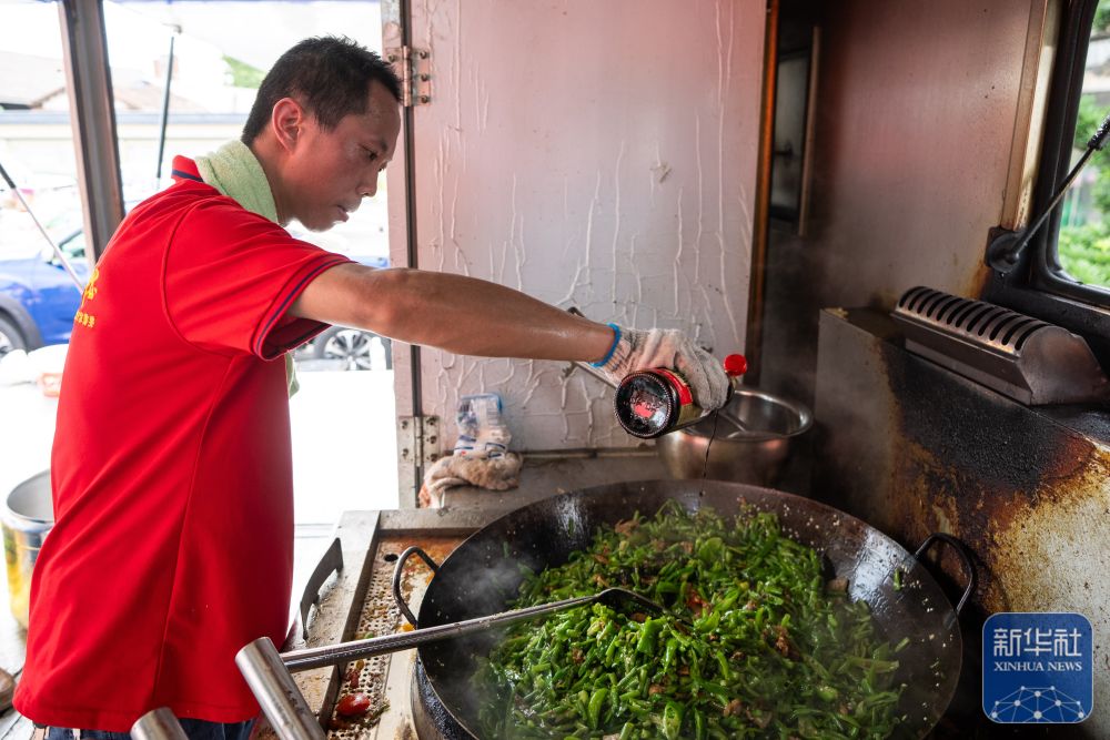 7月10日,在嶽陽市良心堡鎮望君洲村,誌願者在炒製菜肴。新華社記者 陳思汗 攝