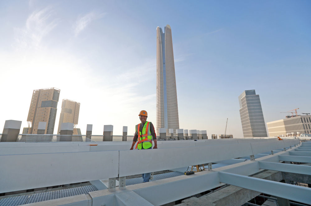 這是2023年11月22日在埃及開羅以東(dong) 的埃及新行政首都中央商務區拍攝的一名在高樓樓頂施工的中國工人。新華社記者隋先凱攝