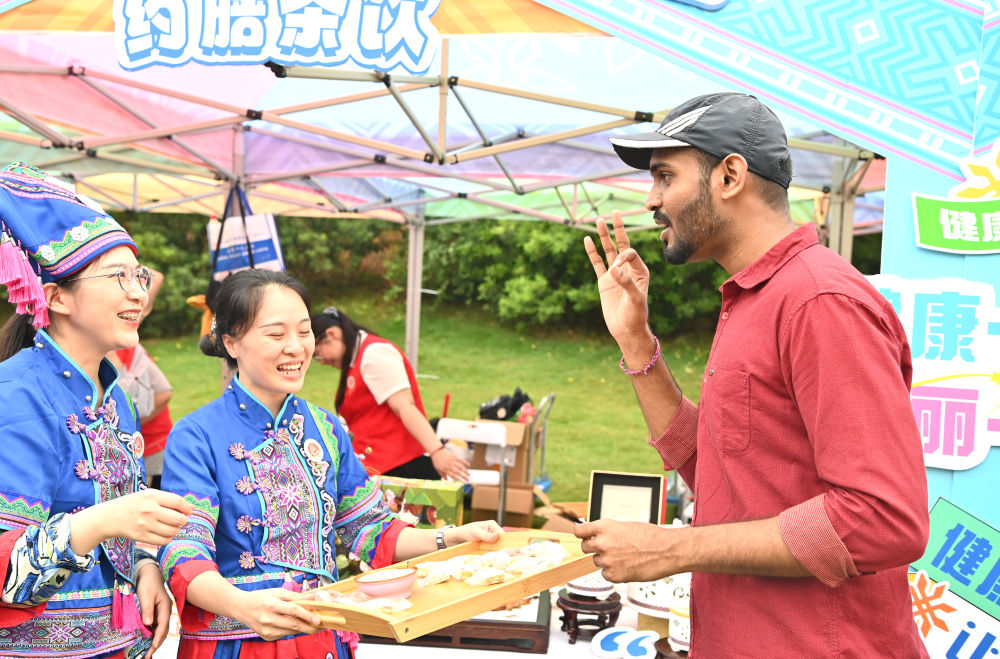 2024年4月11日,一名外國遊客在“廣西三月三·八桂嘉年華”活動廣西南寧市青秀山主會(hui) 場品嚐美食後做出“OK”手勢。新華社記者周華攝