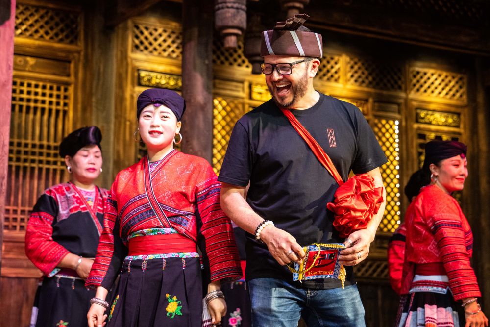 在廣西龍勝黃洛瑤寨,外國遊客與(yu) 村民演員在紅瑤民俗文化表演中互動(6月26日攝)。新華社記者 陳思汗 攝