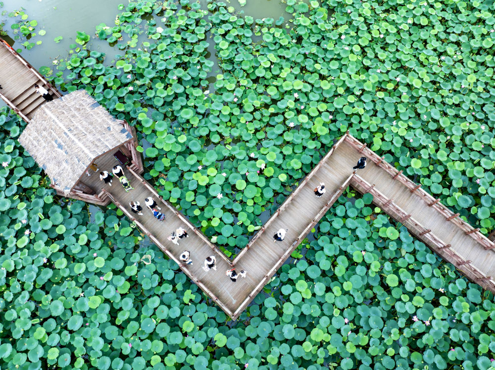 7月14日,遊客在江蘇省揚州市江都區丁夥(huo) 鎮樸園欣賞風景(無人機照片)。新華社發(任飛攝)
