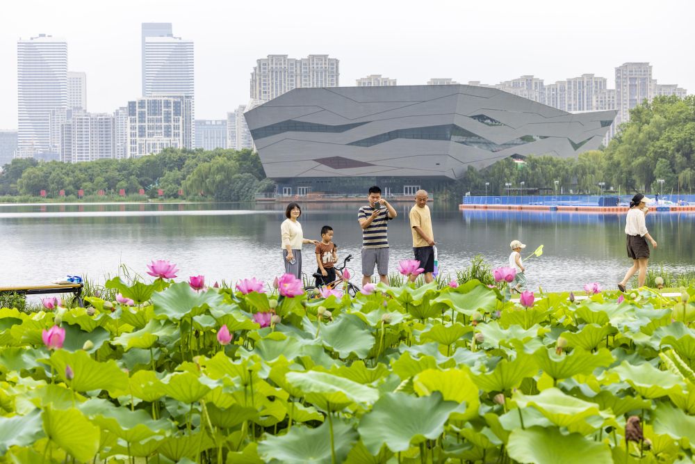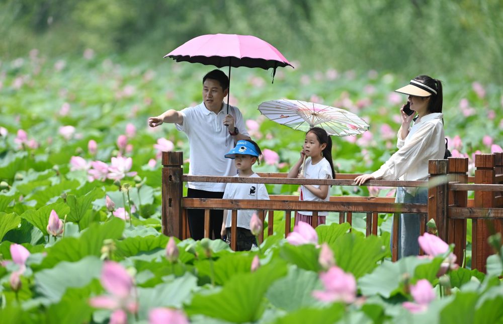 7月14日,人們(men) 在江蘇省泰州市天德湖公園荷花池賞荷遊玩。新華社發(湯德宏攝)