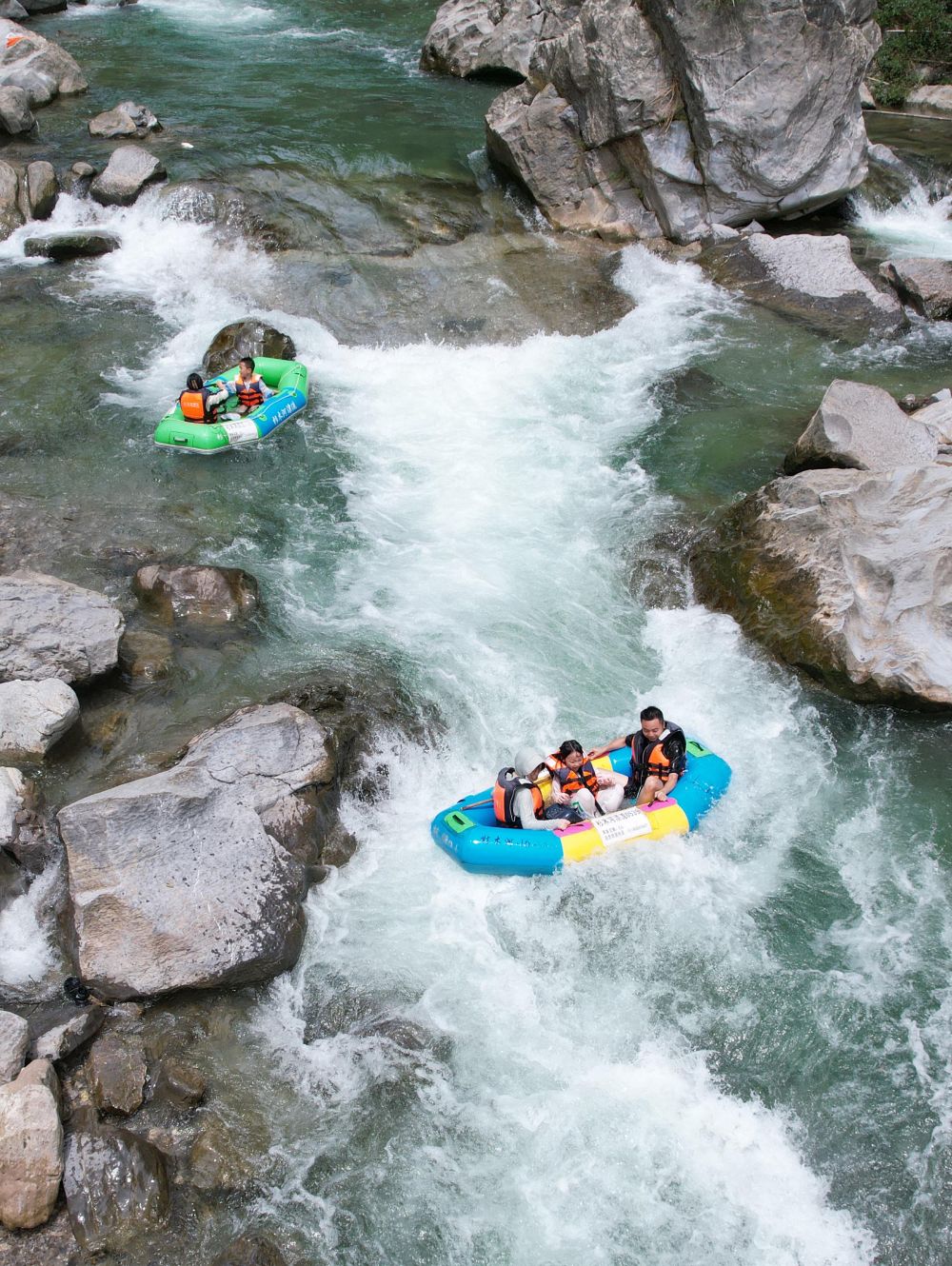 7月13日,遊客在貴州省黔東(dong) 南苗族侗族自治州施秉縣杉木河景區漂流(無人機照片)。新華社發(磨桂賓攝)