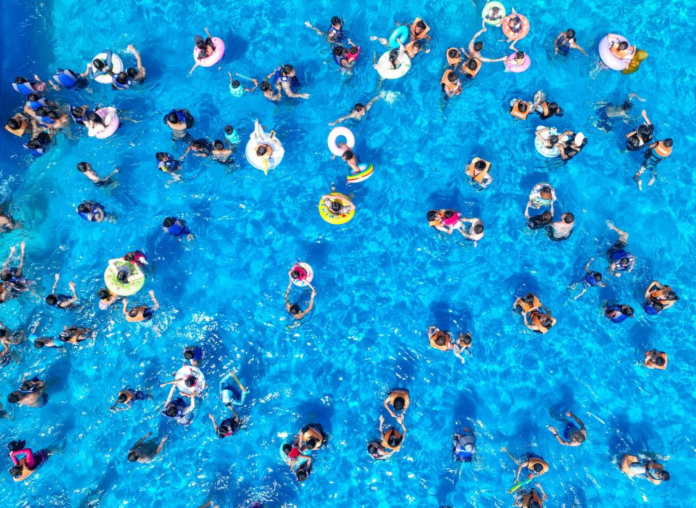7月14日,人們(men) 在重慶市酉陽土家族苗族自治縣一水上樂(le) 園遊玩戲水(無人機照片)。新華社發(邱洪斌攝)