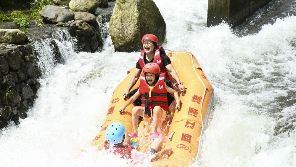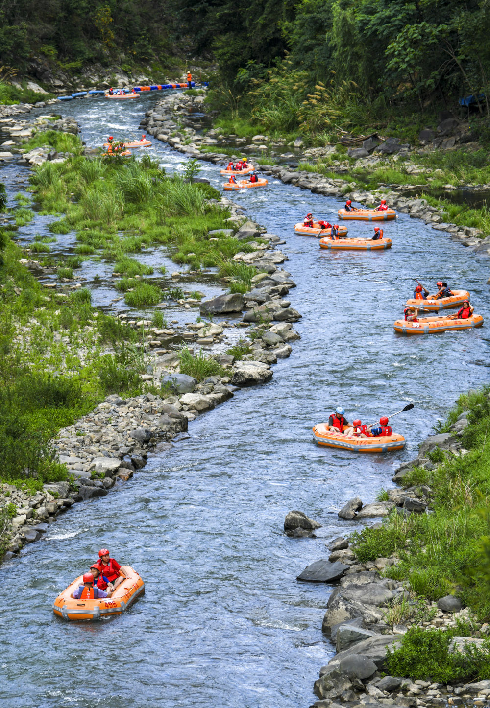 7月14日,遊客在湖南省常寧市塔山瑤族鄉(xiang) 西江漂流景區漂流。新華社發(周秀魚春攝)