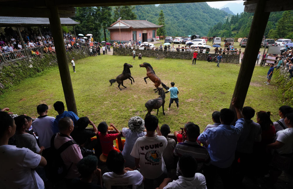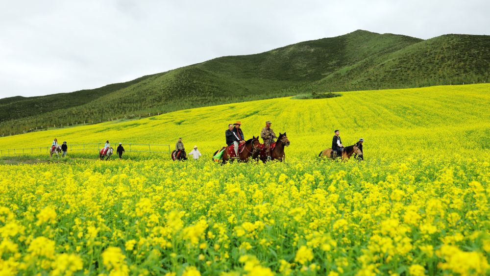 7月13日,遊客騎馬遊覽甘肅省張掖市民樂(le) 縣扁都口生態景區油菜花海。新華社發(成林攝)