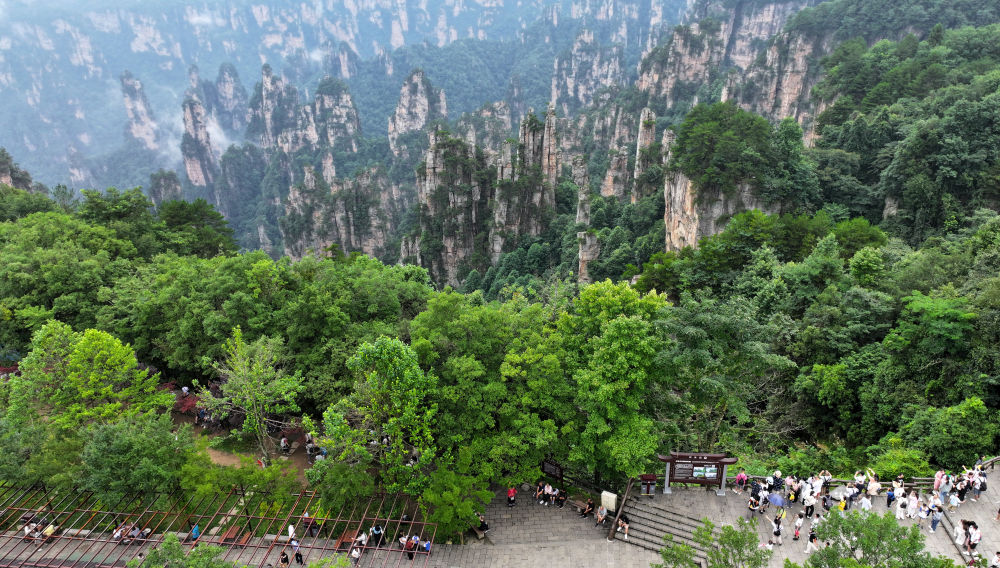 7月14日,遊客在張家界國家森林公園天子山遊覽(無人機照片)。新華社發(吳勇兵攝)