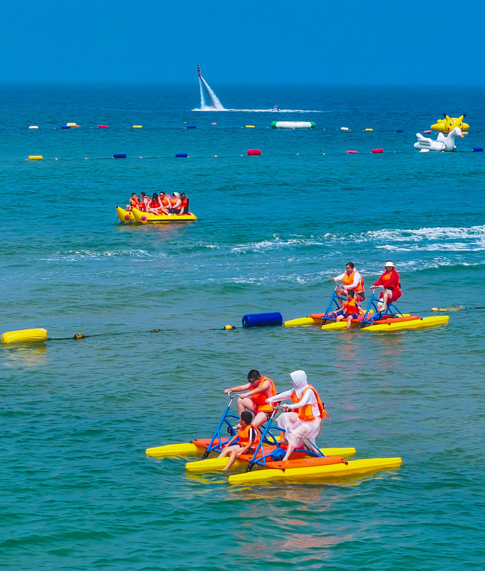 7月13日,遊客在山東(dong) 省榮成市那香海海水浴場體(ti) 驗水上娛樂(le) 項目(無人機照片)。新華社發(李信君攝)