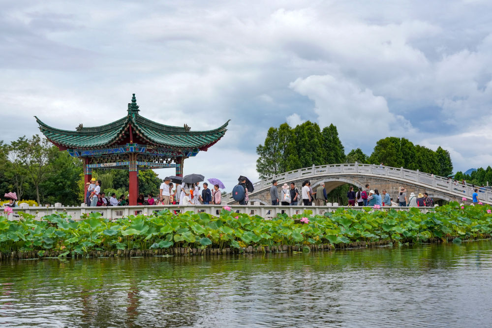 7月13日,遊客在昆明市大觀公園內(nei) 觀賞荷花。新華社發(郝亞(ya) 鑫攝)