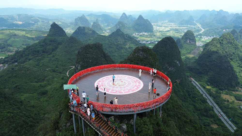 7月13日,遊客在廣西桂林市陽朔縣如意峰觀景(無人機照片)。新華社發(廖祖平攝)
