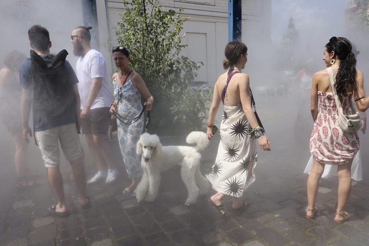 7月11日,在匈牙利布達佩斯,人們(men) 在噴霧裝置中感受清涼一刻。新華社發(弗爾季·奧蒂洛攝)