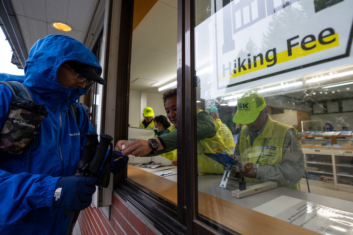 7月1日,在日本山梨縣富士山吉田路線五合目登山口購票處,工作人員為(wei) 遊客戴上象征已支付登山通行費的腕帶。新華社記者張笑宇攝