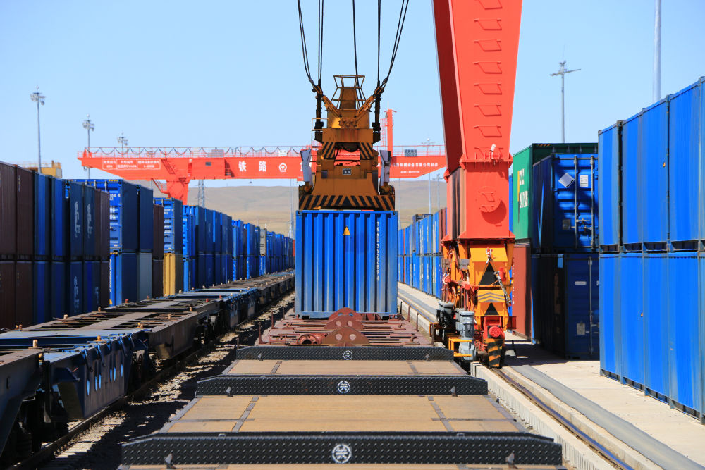 5月15日,中國鐵路哈爾濱局集團有限公司滿洲裏站貨運車間集裝箱場在對中歐班列進行換裝作業(ye) 。新華社發(黃旭攝)