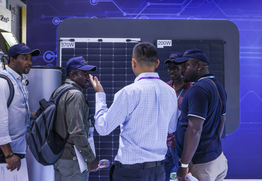 4月15日,參展商在第135屆廣交會(hui) 上向采購商介紹太陽能電池組件展品。新華社記者 劉大偉(wei) 攝