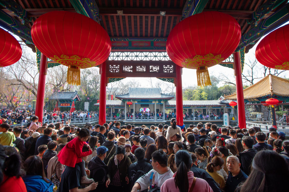 2月14日,遊客在山東(dong) 濟南趵突泉景區遊玩。春節假期,許多景區迎來客流高峰,文旅消費市場火爆。 新華社發(徐舟 攝)