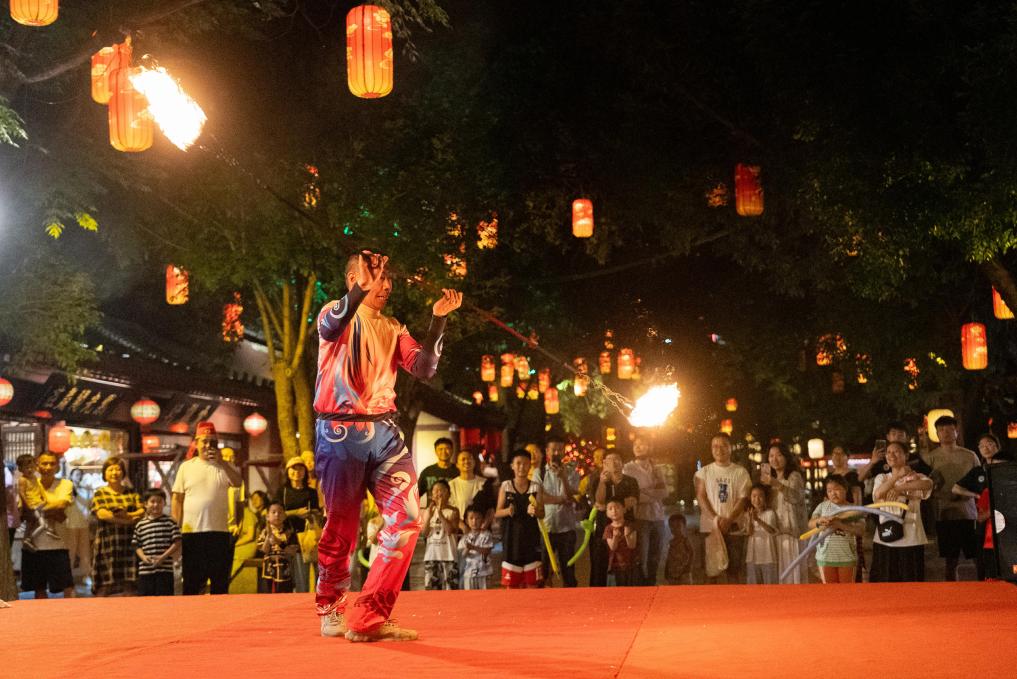 遊客在開封清明上河園景區內(nei) 觀看民俗表演(6月27日攝)。新華社發(受訪者供圖)