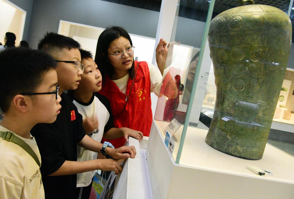 7月14日,在江蘇省鎮江博物館,江蘇大學誌願者為(wei) 小朋友介紹文物。新華社發(石玉成 攝)