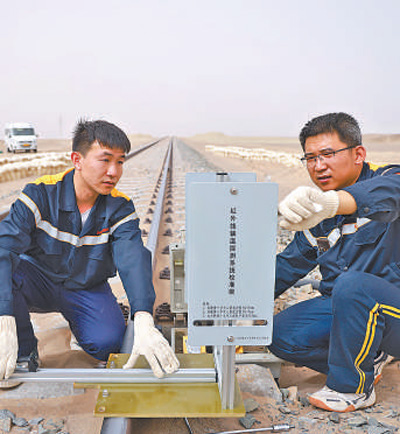 台欣龍(右)和同事在對紅外線軸溫探測設備探頭進行方位角矯正。