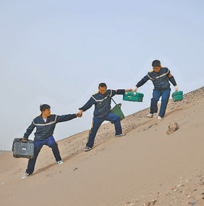班組成員在翻越沙丘。 2014年,烏(wu) 魯木齊西車輛段哈密動態檢測車間哈羅班組正式成立,負責維護哈羅鐵路沿線設備。10年來,哈羅班組堅守在環境惡劣、條件艱苦的羅布泊,克服重重困難,做好鐵路巡檢和故障維修,保障鉀肥運輸。 羅布泊,位於(yu) 新疆東(dong) 南部塔克拉瑪幹沙漠邊緣,天上無飛鳥,地上不長草,隻有漫無邊際的沙漠、戈壁、鹽堿灘。 這裏一年中有200多天風沙肆虐,夏季氣溫超過50攝氏度,冬季氣溫低至零下30攝氏度。這裏是中國鐵路烏(wu) 魯木齊局集團有限公司烏(wu) 魯木齊西車輛段哈密動態檢測車間哈羅班組工作的地方。 是什麽(me) 讓他們(men) 選擇到羅布泊工作?又是什麽(me) 工作值得他們(men) 在這裏堅守10年? “鐵路修到哪兒(er) ,人員就要配到哪兒(er) ” 嗚—— “火車進站了,快!” 哈羅班組工長台欣龍和夥(huo) 伴們(men) 衝(chong) 向站台,幾個(ge) 人一下子堵在了車門前。 “老吳,這回有啥?” “今兒(er) 有羊肉、雞蛋,還有一袋子番茄。” “嘿嘿嘿。” 車門旁,幾個(ge) 大小夥(huo) 兒(er) 咧著嘴憨笑。 台欣龍工作的地方,叫羅中站,是哈羅鐵路的最後一站,地處羅布泊中心。這裏雖通了電、通了水,但米、麵、糧、油、飲用水等生活物資全靠火車從(cong) 400公裏外的哈密市送來。 “大小夥(huo) 兒(er) 們(men) ,自己搬水。”列車長老吳一聲令下,台欣龍和夥(huo) 伴們(men) 麻利地爬上車,一人扛下一桶15升的礦泉水。 “這兒(er) 的水堿性大,一燒開,全是白粒粒,沒法喝。”台欣龍說,這15升礦泉水得撐一周。 在羅中站,差不多每隔5天會(hui) 有通勤列車抵達,送來各類物資。 列車停留5小時,隨即返程。羅中站經曆短暫的熱鬧後,再次回歸平靜。 除了人少、地荒、物資緊,寂寞、單調或許是在羅中站工作、生活麵臨(lin) 的最大困難。 這裏沒有商店、沒有飯館、沒有影院。白天,手機還能有網絡信號,晚上則幾乎沒有信號。乒乓球、象棋以及少量書(shu) 籍,為(wei) 台欣龍和夥(huo) 伴們(men) 提供了少有的娛樂(le) 方式。 2014年,中國鐵路烏(wu) 魯木齊局集團有限公司烏(wu) 魯木齊西車輛段哈密動態檢測車間哈羅班組正式成立,負責維護哈羅鐵路沿線設備。當年,剛畢業(ye) 的台欣龍來到了這裏。 當時也沒想太多,覺得在哪裏都是幹活,就接受了單位安排。“鐵路修到哪兒(er) ,人員就要配到哪兒(er) ,這活總得有人幹。”台欣龍說。 如今,哈羅班組共有7人,大夥(huo) 兒(er) 隔10天輪一次班。班組裏年齡最大的丁鵬今年51歲了,最小的永誌帥和杜權也已31歲。 “假如某個(ge) 檢測站發出故障警報,無論什麽(me) 天氣,都必須立即響應” 淩晨3時20分,顛簸了近5個(ge) 小時,台欣龍和兩(liang) 名隊員到達了黑龍峰動態設備檢測站。這裏,距離羅中站230公裏。 夜間出行,沒有道路、沒有路燈、沒有導航,台欣龍駕駛著皮卡車朝著鐵路延伸的方向在茫茫戈壁灘裏蹚出路。這一路大坑套小坑,人的腦袋時不時頂到車頂,撞得生疼。 下了車,風裹著沙子打在臉上、頭燈上,幾乎掩蓋了說話聲。時間長了,台欣龍和隊友們(men) 便形成了默契,隻需一個(ge) 手勢,便知道對方的意思。 4時10分,台欣龍和隊友開始作業(ye) 。 打開紅外線軸溫探測設備(THDS)的機蓋,映入眼簾的是一層厚厚的沙塵。台欣龍熟練地拿出吹風機、毛刷,仔細清理室外探頭箱裏的沙塵,再把黑體(ti) (一種檢測設備)放置在探頭箱上,進行溫度檢測校準。 “我們(men) 這裏夏季溫度高,若列車輪對軸溫超標,就有斷軸風險,引發安全事故。檢測儀(yi) 器必須保證準確性。”台欣龍解釋,根據標準,THDS低溫檢測誤差正負不得超過2攝氏度,高溫時段不得超過3攝氏度。“但我們(men) 自己的要求是將誤差控製在1攝氏度。” 早晨7時,台欣龍一行結束檢測任務,踏上了回程路,直到中午12時才趕回駐地。 “今天這一路,算順利的。”台欣龍說,“假如某個(ge) 檢測站發出故障警報,無論什麽(me) 天氣,都必須立即響應。”在羅布泊,沙塵暴說來就來,一刮就是三四個(ge) 小時。有一回,他們(men) 遇上特大沙塵暴,風暴像堵牆一樣迎麵撲來。越野車迎風的一側(ce) ,車漆幾乎全被風沙打掉。“幸虧(kui) 附近有座橋涵,大夥(huo) 兒(er) 在裏頭躲了3個(ge) 多小時。”風暴過後,衣服上、頭發上、耳朵裏、鼻孔裏全都是沙子。一抬腳,鐵道路基上的風沙已沒過膝蓋。 還有一次,冬季雪夜,台欣龍和隊友們(men) 去處理緊急故障。大雪的掩蓋,讓茫茫戈壁更難辨認方向。“我們(men) 一不小心走錯了方向,跑了很多冤枉路,最終汽車油料不足,隻能請求救援,天亮了才出來。”台欣龍說。 “檢修得跟上,為(wei) 鉀肥運輸做好保障” 無水、無人、無城,哈羅鐵路為(wei) 何要修往羅布泊? 原來,羅布泊寸草不生的地表之下,藏著世界上最大的硫酸鹽型含鉀鹵水礦床,占全國鉀資源量的三成。 長期以來,我國耕地麵積中一半以上缺鉀,偏偏鉀鹽在我國屬稀缺礦種,農(nong) 民此前用的鉀肥,85%以上依賴進口。羅布泊的發現,讓許多人興(xing) 奮不已。 一批批創業(ye) 者白手起家,讓羅布泊這個(ge) 不毛之地長出了世界上最大的硫酸鉀生產(chan) 廠——國投新疆羅布泊鉀鹽有限責任公司。最初,這些鉀肥都是通過哈羅公路運出,但隨著產(chan) 量的提升,公路已無法滿足運輸需求。 哈羅鐵路的建設因此被提上日程。北起哈密南火車站,途經9個(ge) 車站,直達羅布泊中心。項目總投資29.93億(yi) 元,2010年8