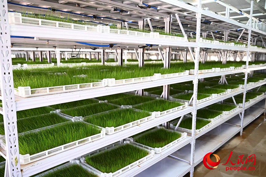 除了飼養(yang) 蘇尼特羊的棚圈之外,牧場中還設計了一座溫室房,裏麵整齊排列的架子上,種植著鬱鬱蔥蔥的燕麥草,這裏被牧民親(qin) 切地稱為(wei) “空中牧場”。