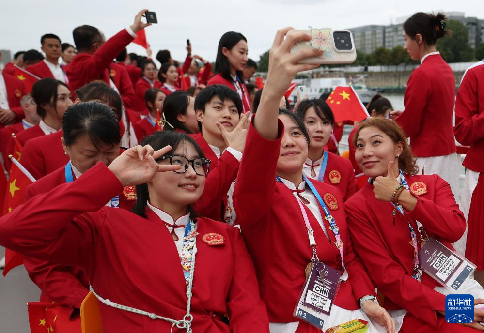 7月26日,中國體(ti) 育代表團成員在開幕式前自拍留影。新華社記者 曹燦 攝