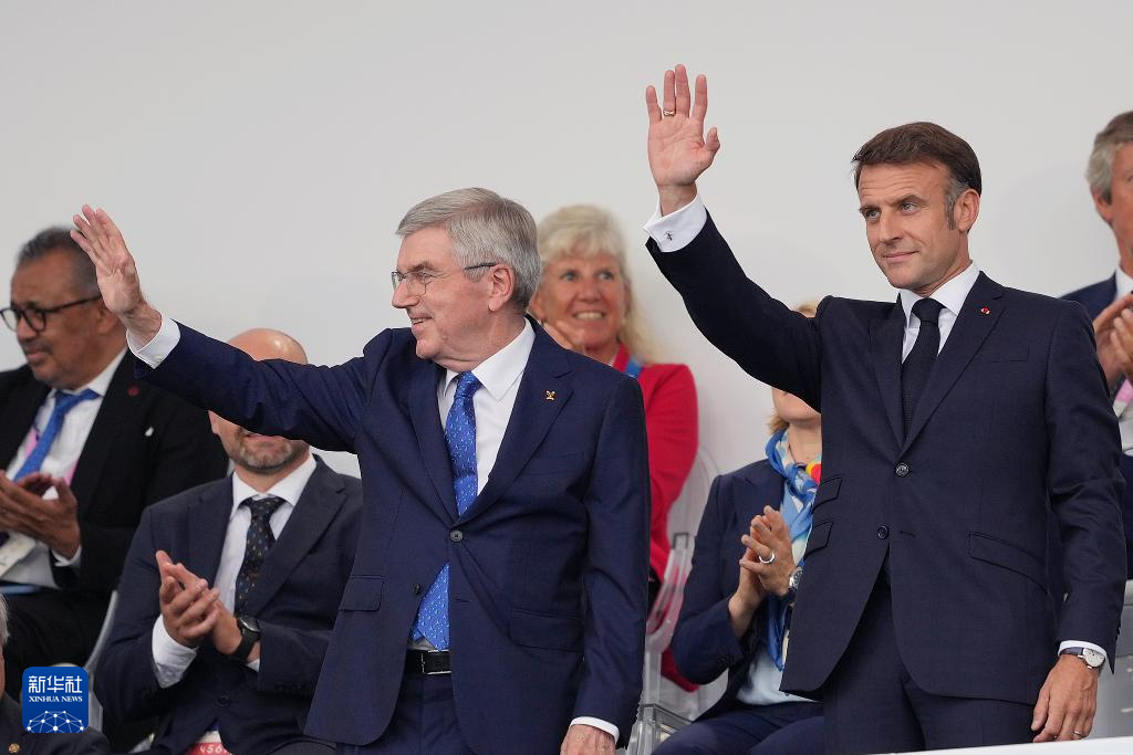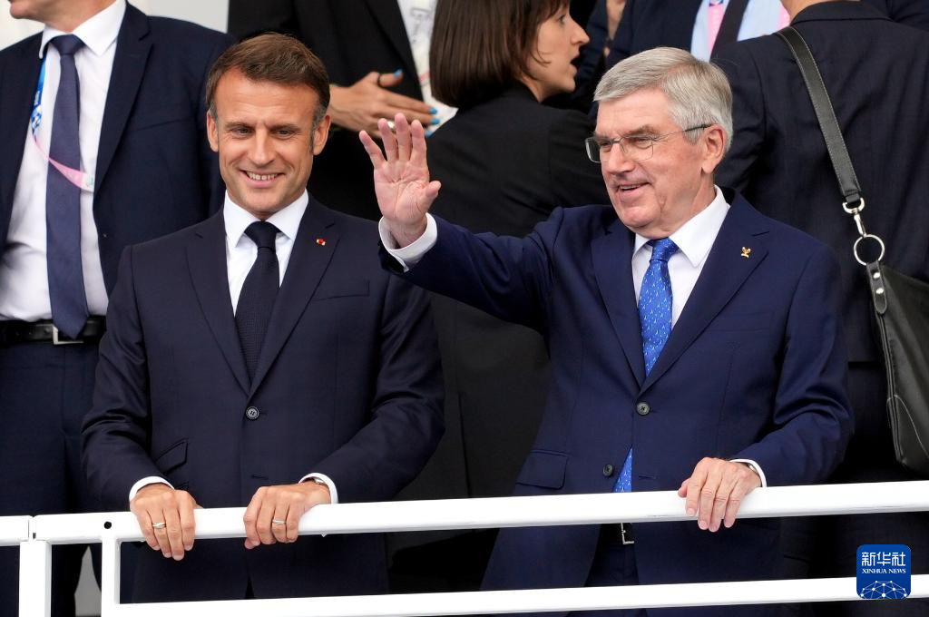 7月26日,國際奧委會(hui) 主席巴赫(右)與(yu) 法國總統馬克龍出席開幕式。新華社記者 王毓國 攝