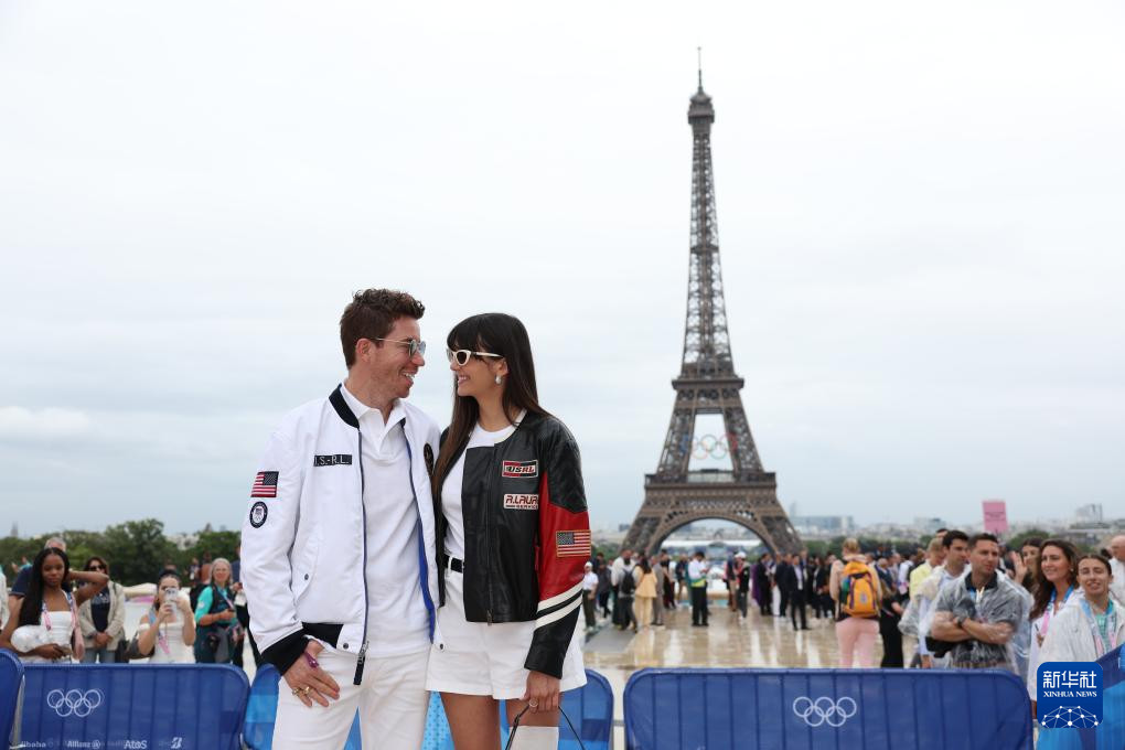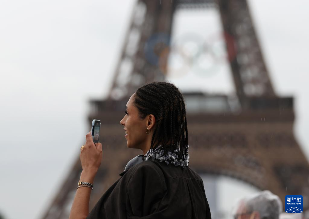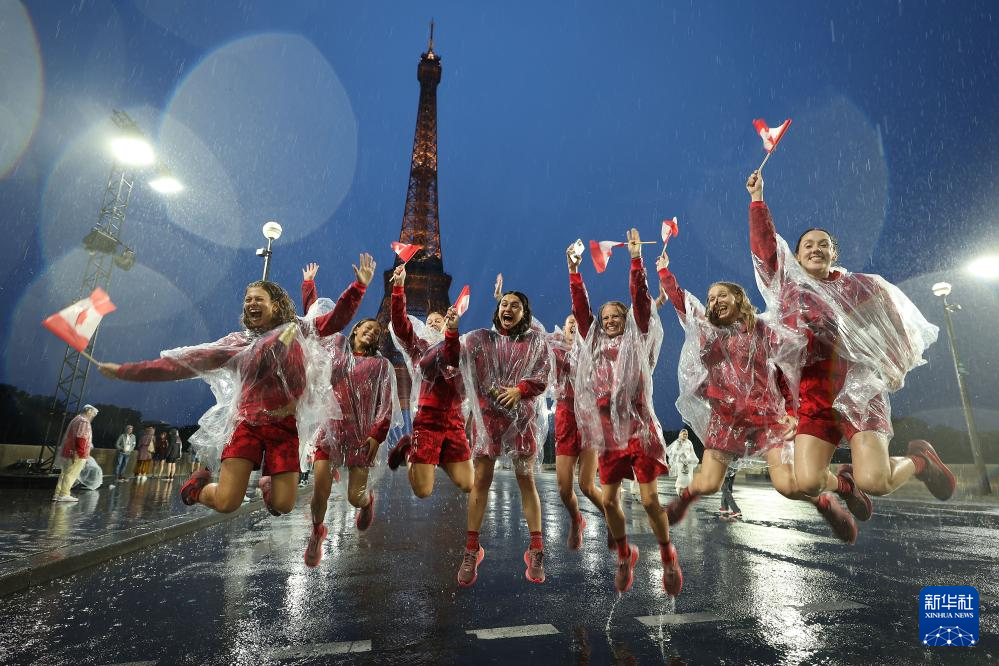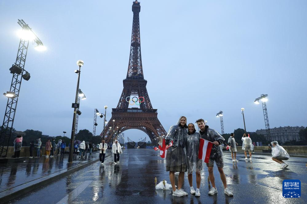 7月26日,加拿大體(ti) 育代表團成員在埃菲爾鐵塔前。新華社記者 李明 攝