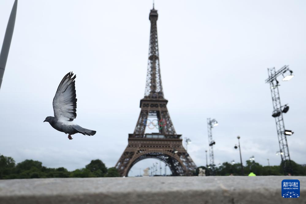 7月26日,一隻鴿子在埃菲爾鐵塔前飛過。新華社記者 李明 攝