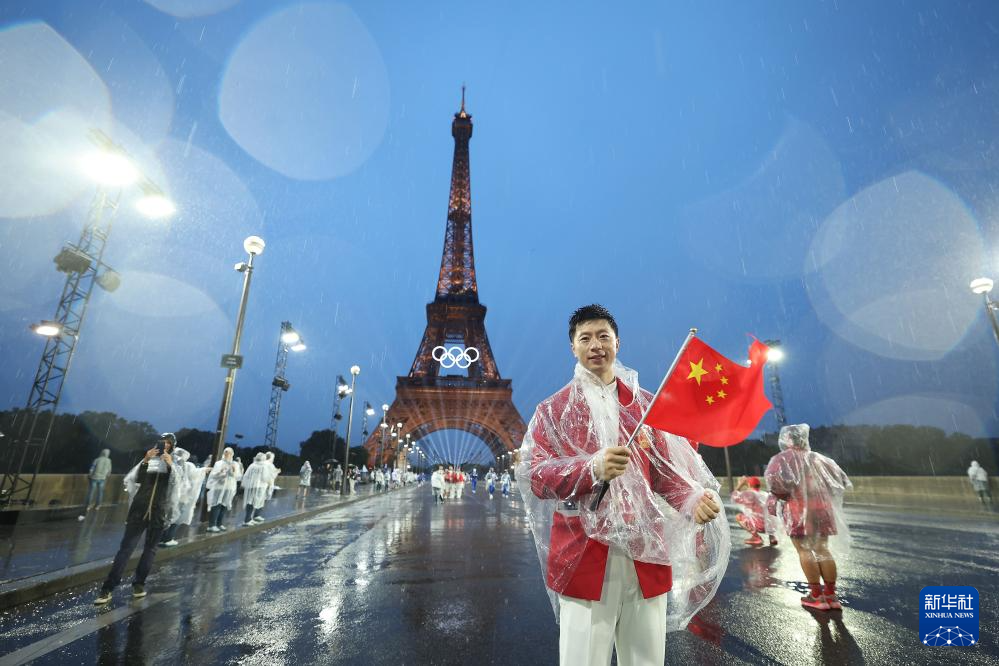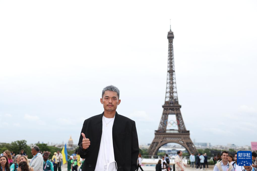 7月26日,中國體(ti) 育代表團旗手、乒乓球選手馬龍在埃菲爾鐵塔前。新華社記者 李明 攝