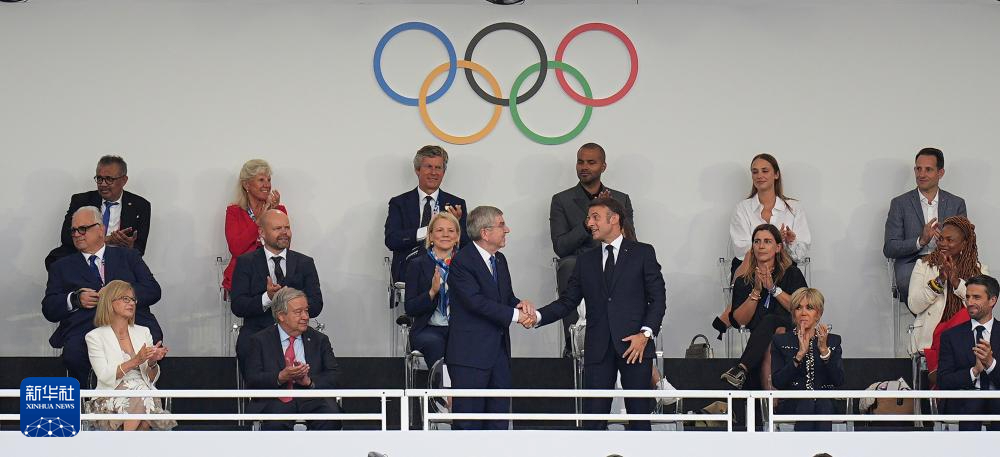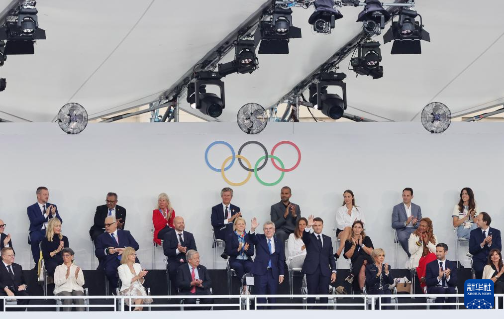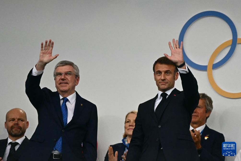 7月26日,國際奧委會(hui) 主席巴赫(上左)和法國總統馬克龍出席開幕式。新華社記者 高靜 攝
