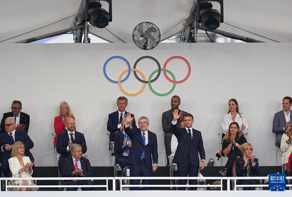 7月26日,國際奧委會(hui) 主席巴赫(前排左五)和法國總統馬克龍(前排右四)出席開幕式。新華社記者 沈伯韓 攝
