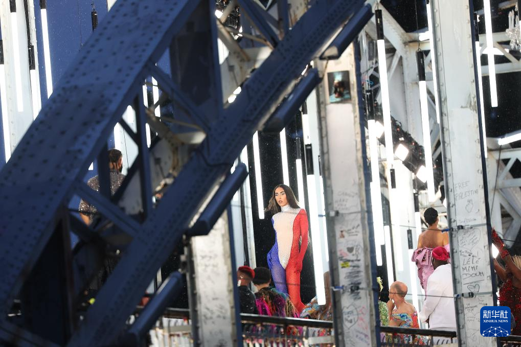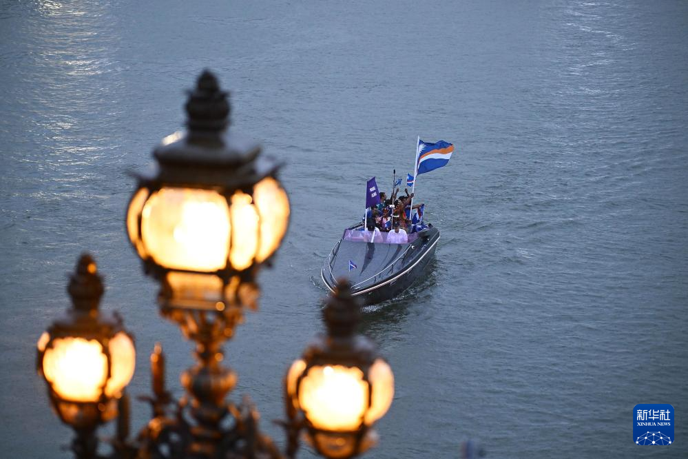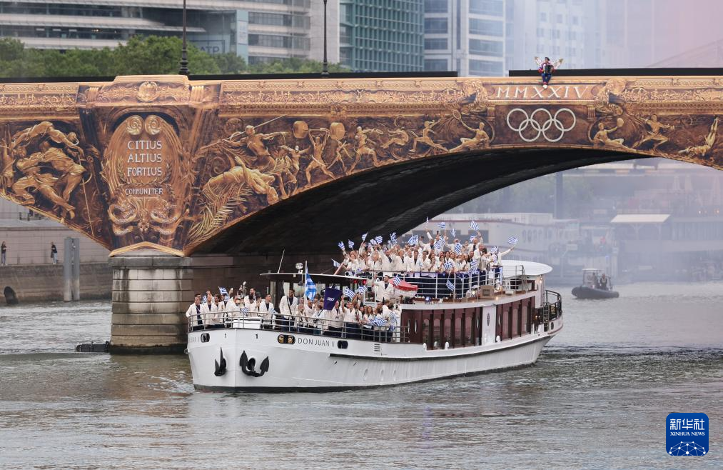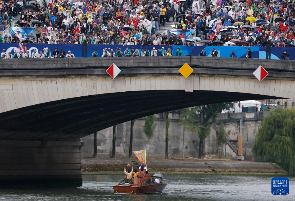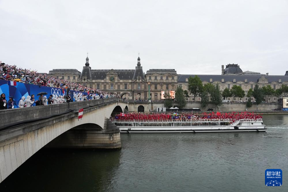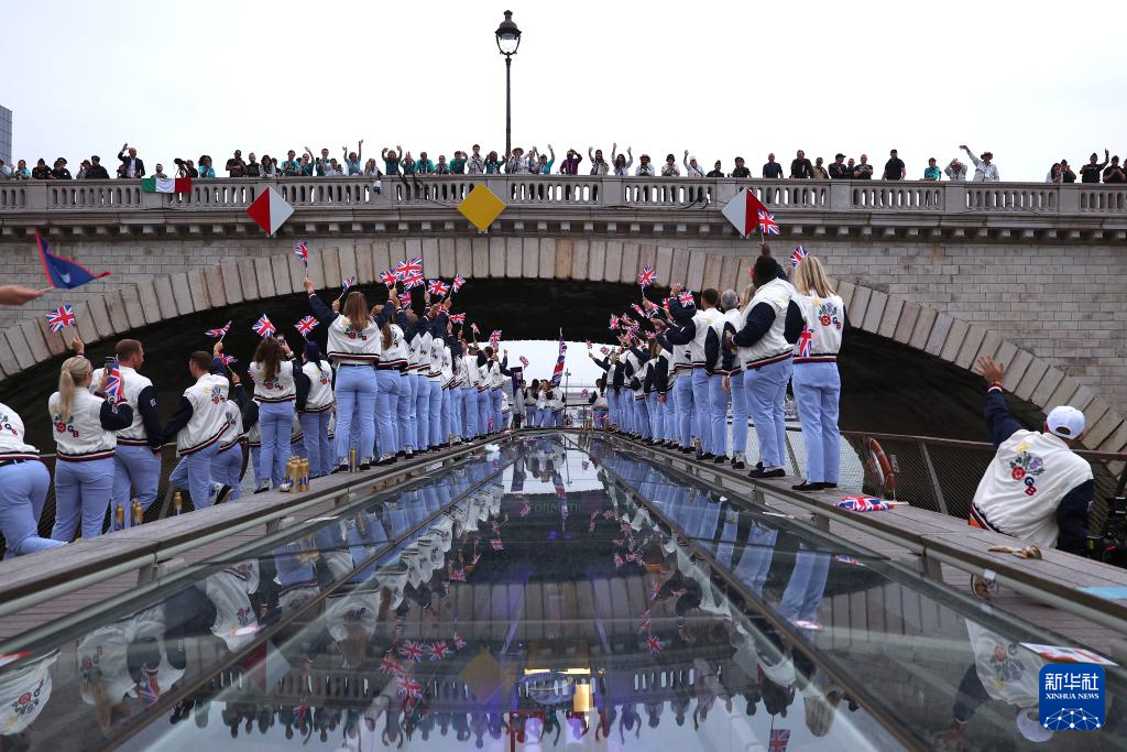 7月26日,各代表團成員在開幕式上抵達耶拿橋。新華社發(POOL照片/盧多維克·馬林)