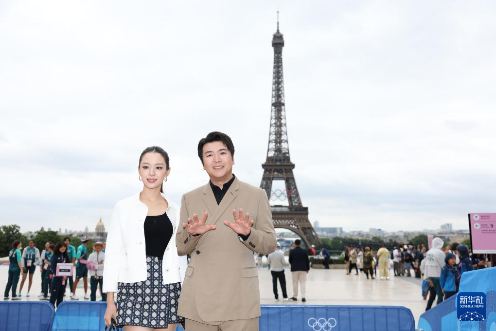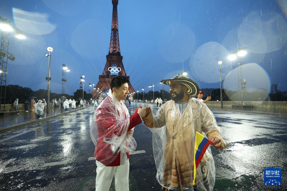 7月26日,中國體(ti) 育代表團旗手、乒乓球選手馬龍(左)與(yu) 哥倫(lun) 比亞(ya) 體(ti) 育代表團成員在埃菲爾鐵塔前相互致意。新華社記者 李明 攝
