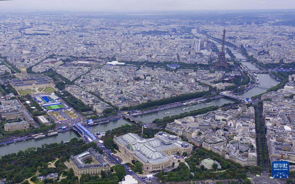 這是開幕式上拍攝的埃菲爾鐵塔(右上)、巴黎大皇宮(下)(7月26日攝)。新華社發(POOL照片)