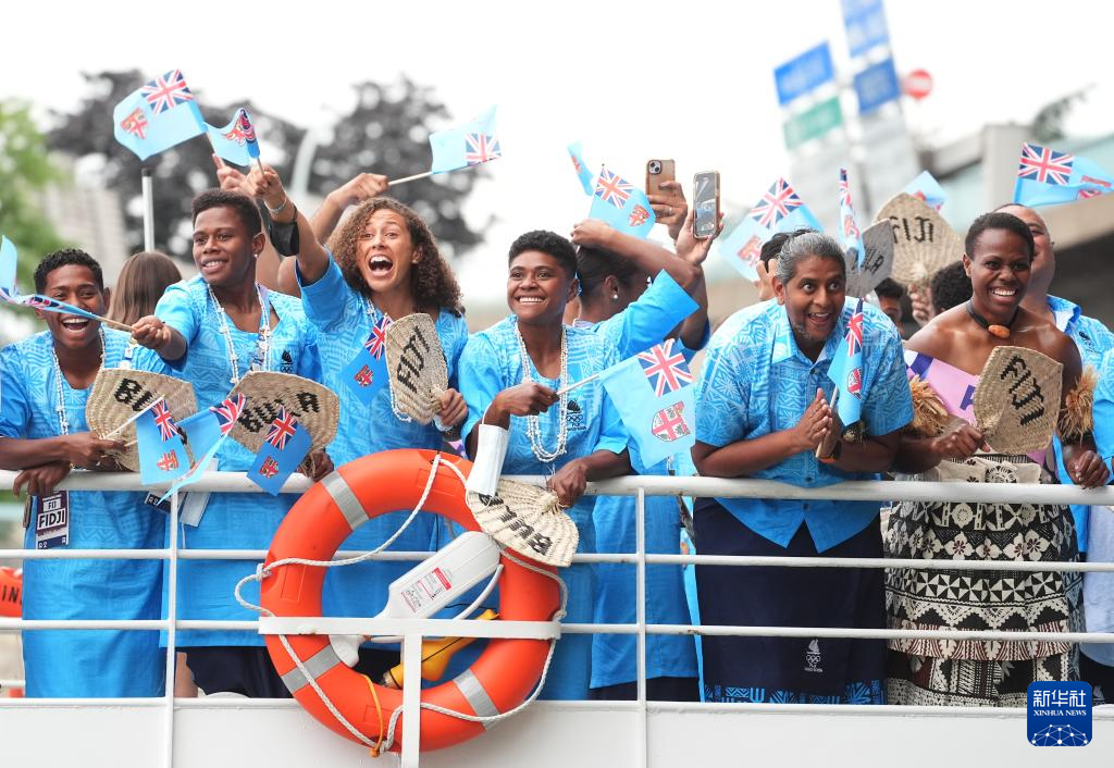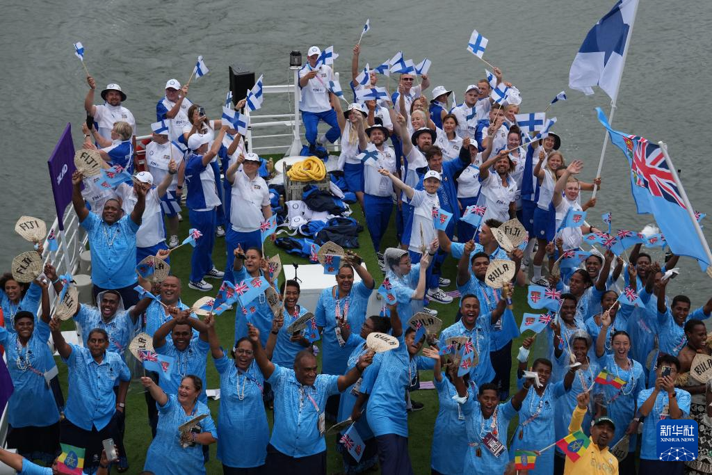 7月26日,芬蘭(lan) 體(ti) 育代表團(上)與(yu) 斐濟體(ti) 育代表團在開幕式上。新華社記者 萬(wan) 象 攝