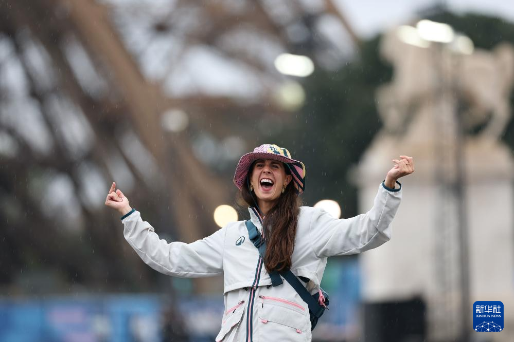 7月26日,一名誌願者在埃菲爾鐵塔前起舞。新華社記者 李明 攝