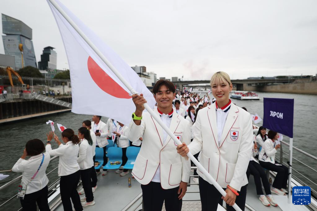 7月26日,日本霹靂舞運動員半井重幸(左)、擊劍運動員江村美咲作為(wei) 日本體(ti) 育代表團旗手在開幕式上。新華社發(POOL照片/邁克爾·裏夫斯)