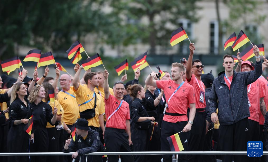 7月26日,德國體(ti) 育代表團成員在開幕式上慶祝。新華社記者 李明 攝pagebreak