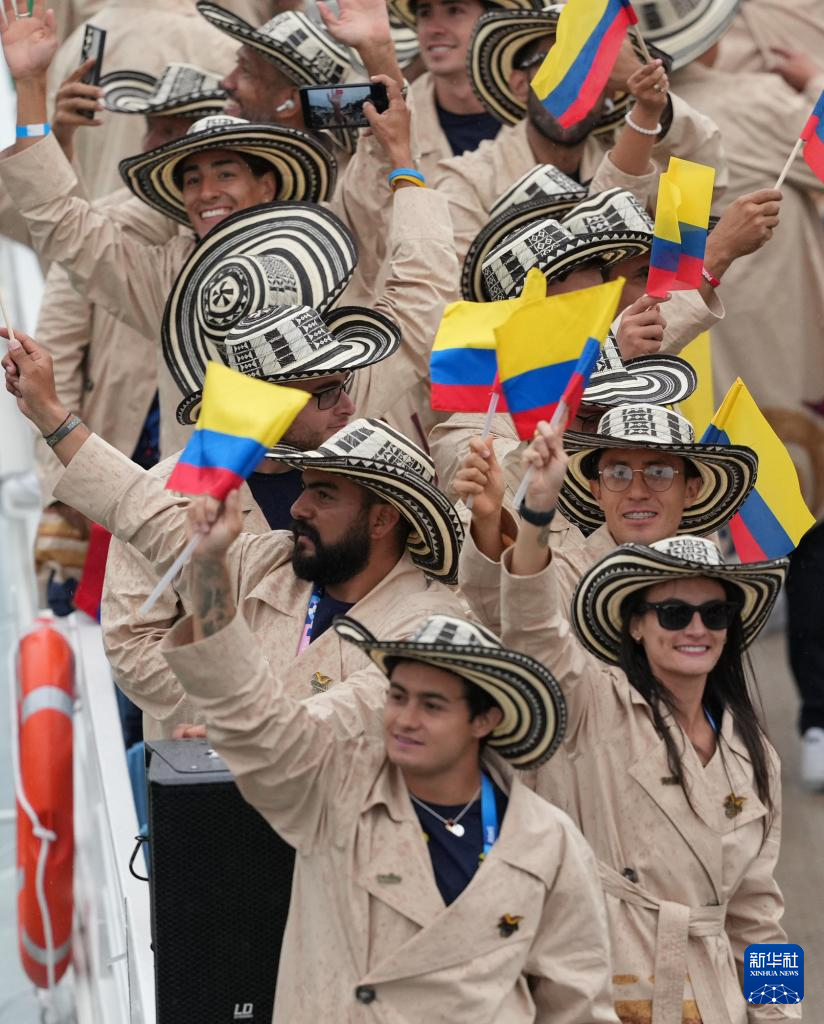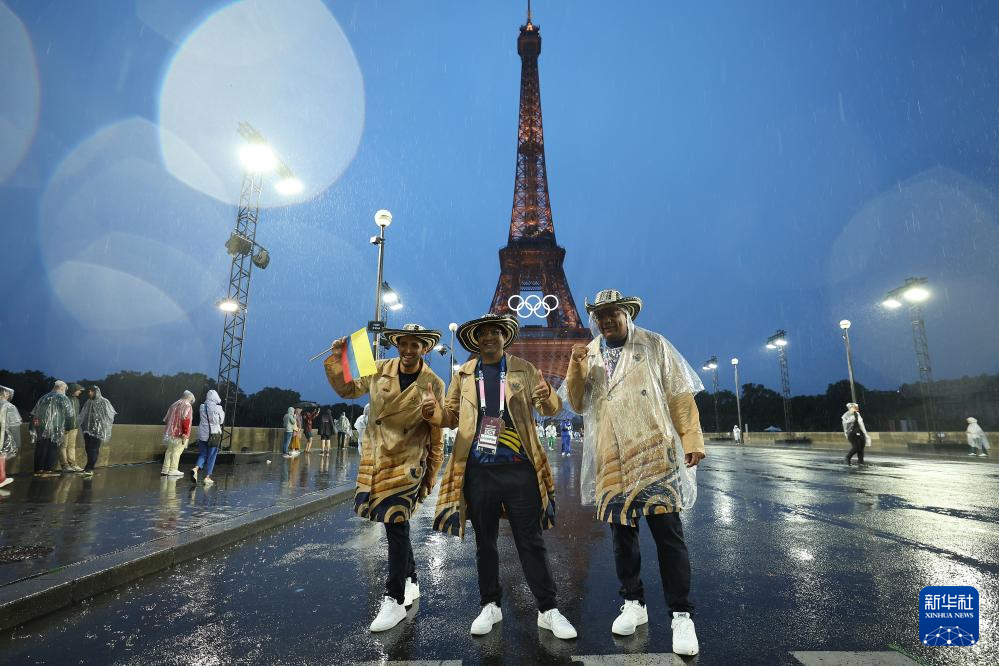 7月26日,哥倫(lun) 比亞(ya) 體(ti) 育代表團成員在埃菲爾鐵塔前。新華社記者 李明 攝