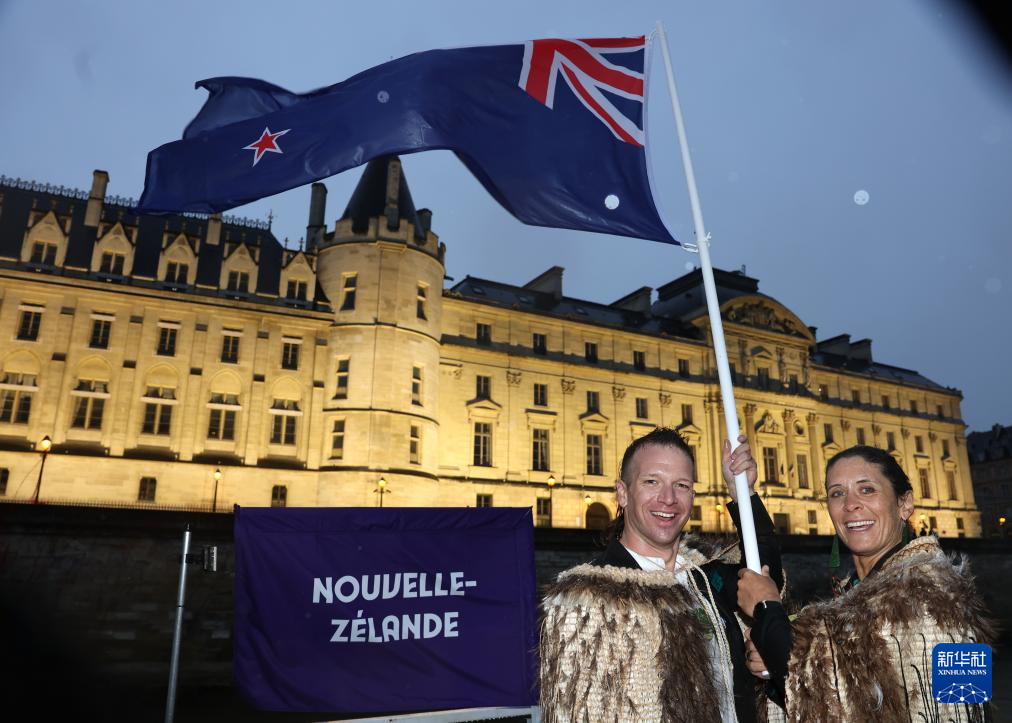7月26日,新西蘭(lan) 體(ti) 育代表團旗手阿倫(lun) ·默裏·蓋特(左)與(yu) 橋·阿萊在開幕式上揮舞國旗。新華社發(POOL照片/漢娜·皮特斯)