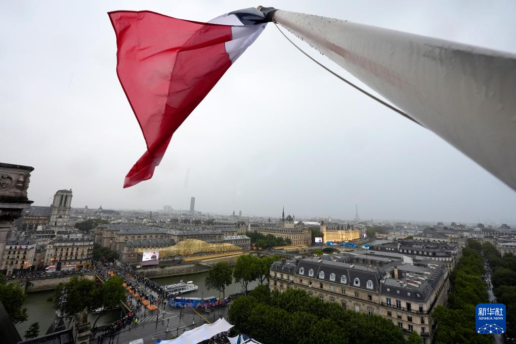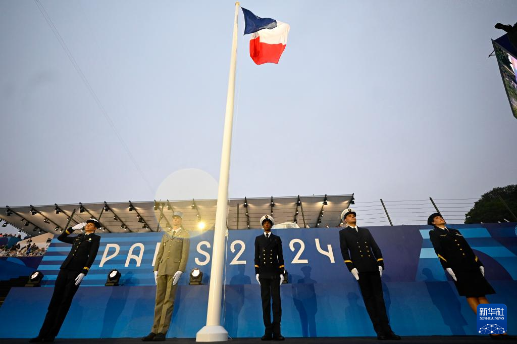7月26日,開幕式上升起法國國旗。新華社發(POOL照片/洛伊克·韋南斯)