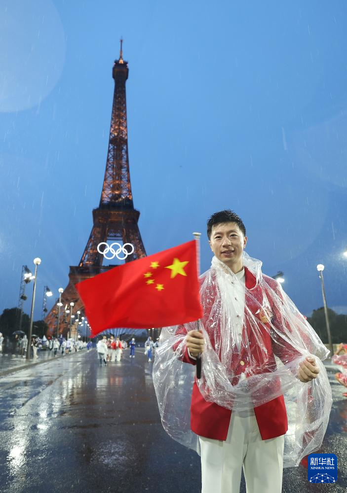 7月26日,中國體(ti) 育代表團旗手、乒乓球選手馬龍在埃菲爾鐵塔前。新華社記者 李明 攝pagebreak