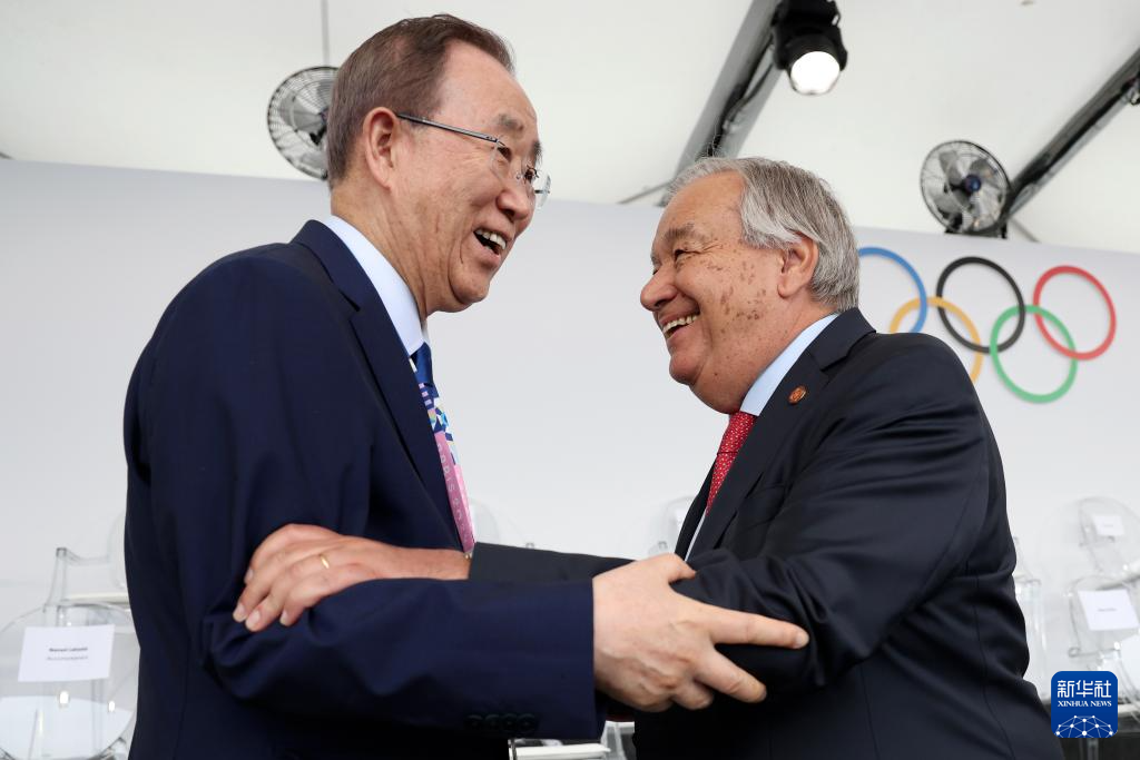 7月26日,聯合國秘書(shu) 長古特雷斯(右)與(yu) 聯合國前秘書(shu) 長潘基文在開幕式前致意。新華社發(POOL照片/帕斯卡爾·勒·塞格雷坦)
