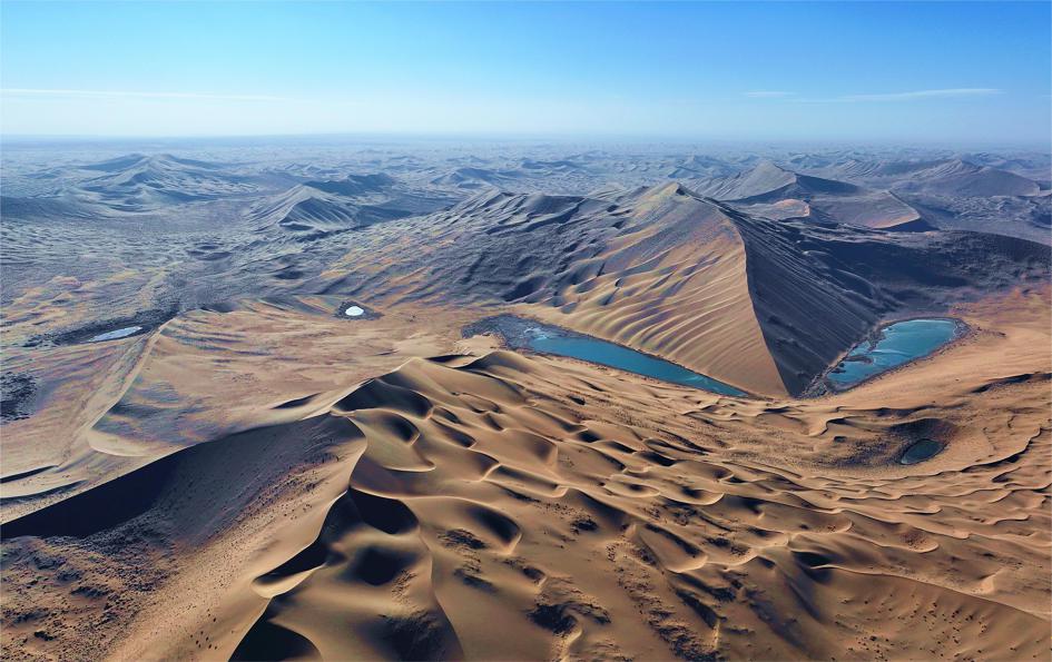巴丹吉林沙漠地處阿拉善高原,屬中國西北極幹旱的溫帶荒漠地區,是中國第三大沙漠和第二大流動沙漠。該地區以連綿起伏的高大沙山和丘間眾(zhong) 多湖泊而聞名,展示了沙漠景觀不斷變換的地質和地貌特征,令人歎為(wei) 觀止,全球少有沙漠可以比肩。巴丹吉林沙漠的重要標誌包括世界最高的固定沙山(相對高度達 460 米)、最密集的沙漠湖泊、最廣闊的鳴沙區域,以及多樣的風蝕地貌。如此獨特的景觀展現了巴丹吉林沙漠非凡的自然美學價(jia) 值,展示著地球上重要、典型且持續的風沙地貌發展過程,同時也是豐(feng) 富多彩的生物棲息地。
