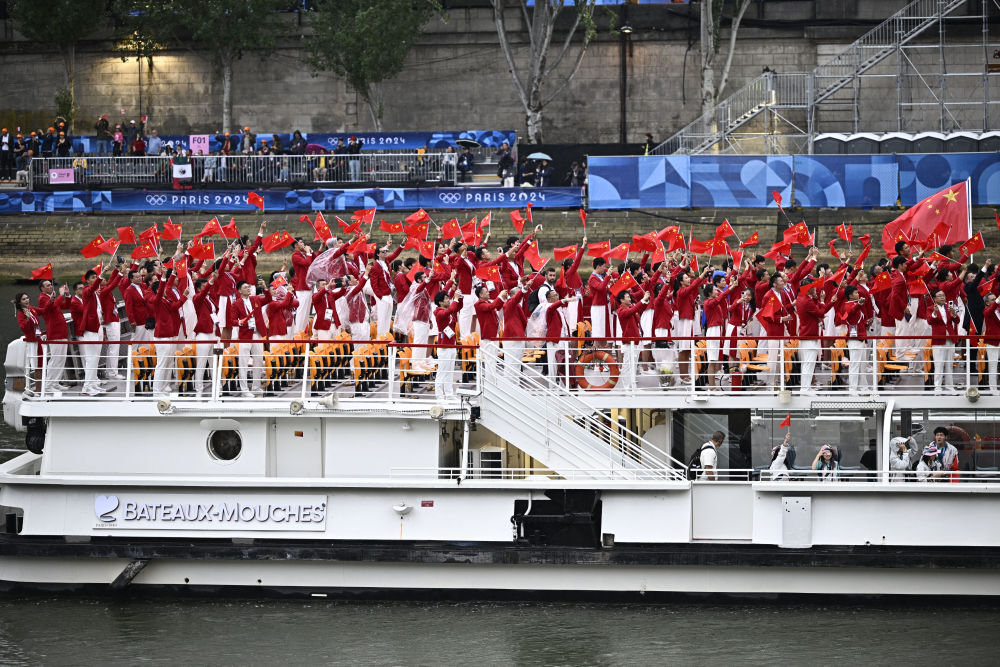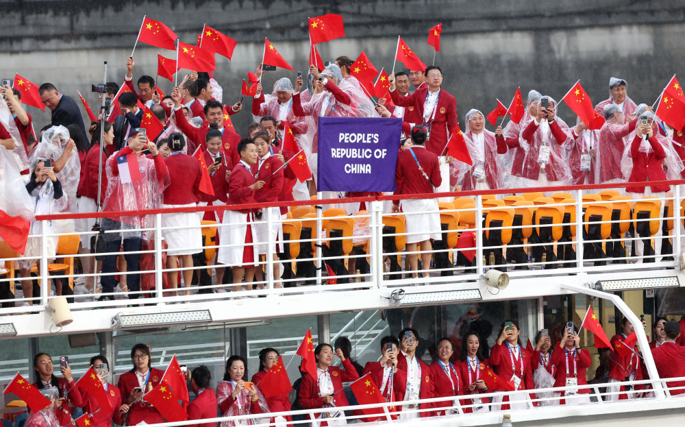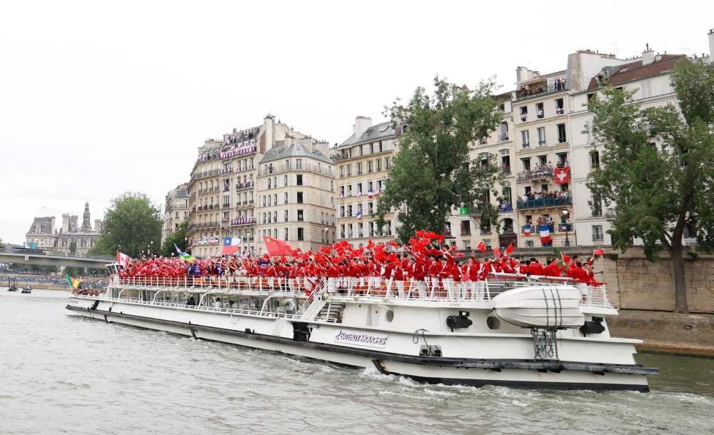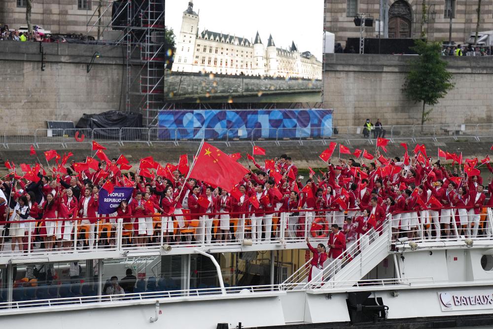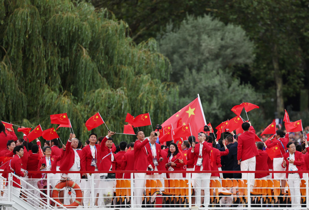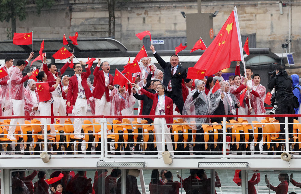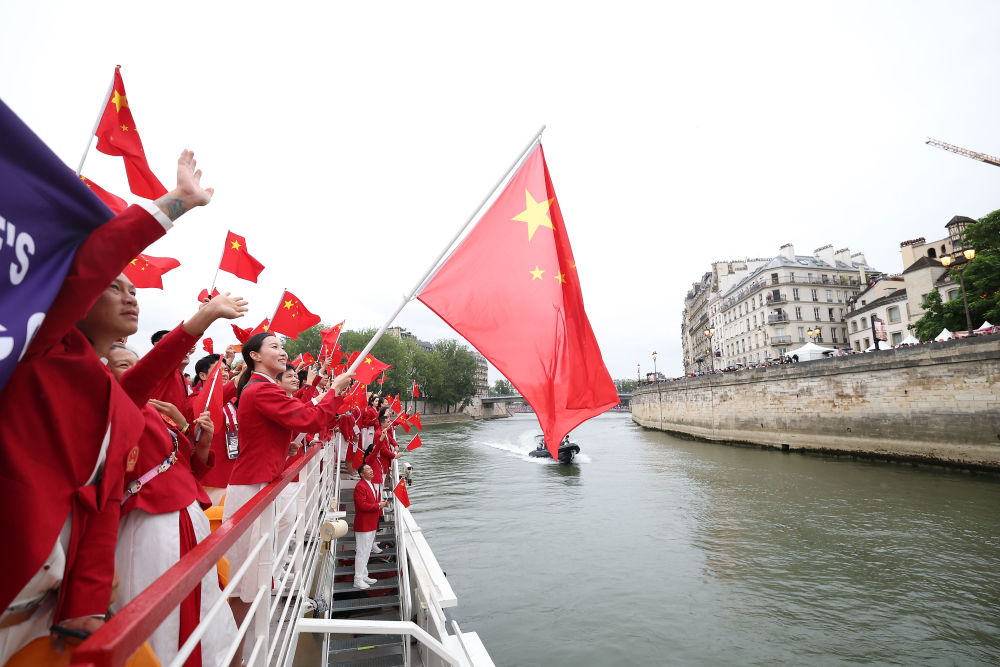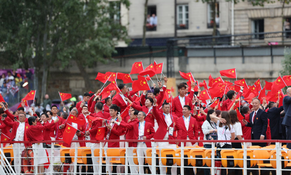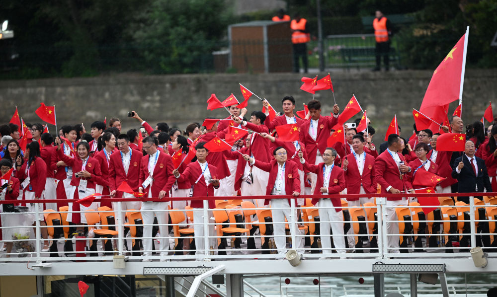 當地時間7月26日,第33屆夏季奧林匹克運動會(hui) 開幕式在法國巴黎舉(ju) 行。乒乓球運動員馬龍、花樣遊泳運動員馮(feng) 雨高擎五星紅旗,中國體(ti) 育代表團運動員乘船在塞納河巡遊。