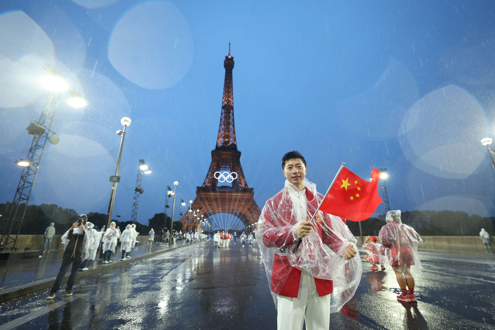 ↑中國體(ti) 育代表團旗手、乒乓球選手馬龍在埃菲爾鐵塔前。新華社記者 李明攝