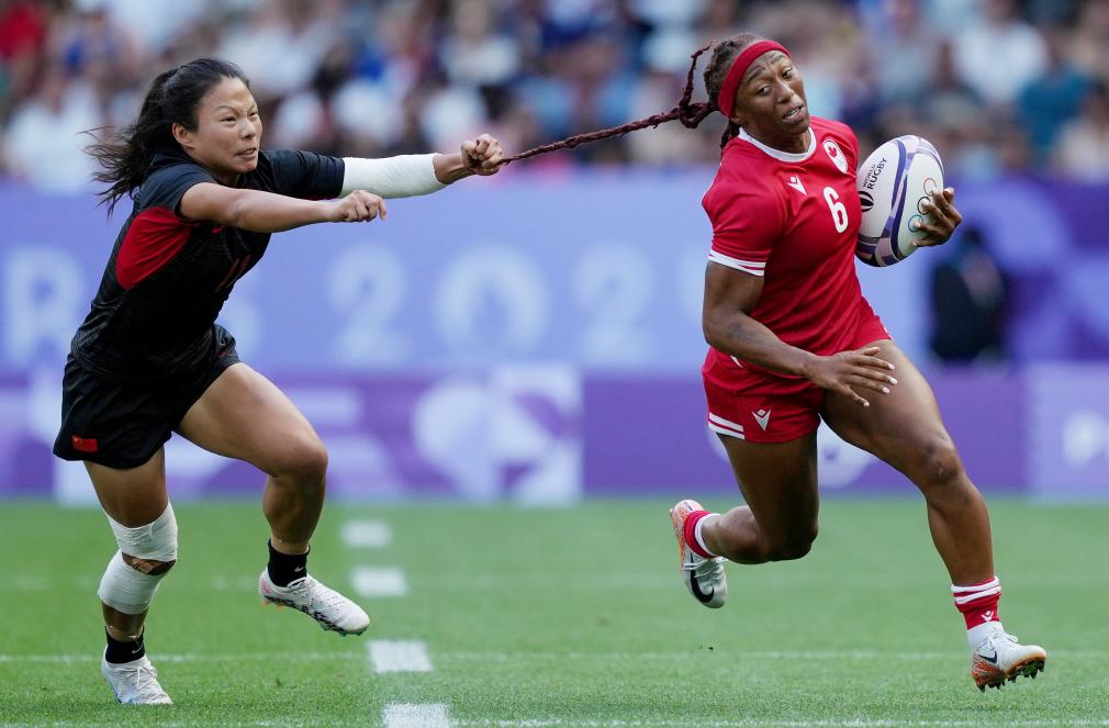 7月29日,中國隊球員劉瀟倩(左)與(yu) 加拿大隊球員夏麗(li) 蒂·威廉姆斯在比賽中。當日,在巴黎奧運會(hui) 七人製橄欖球女子分組循環賽A組比賽中,中國隊17比26不敵加拿大隊。 新華社記者 呂小煒 攝