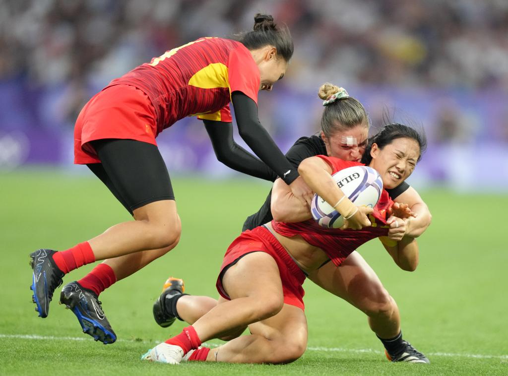 7月29日,中國隊球員胡宇(前)在比賽中。 當日,在巴黎奧運會(hui) 七人製橄欖球女子四分之一決(jue) 賽中,中國隊5比55不敵新西蘭(lan) 隊。 新華社記者 呂小煒 攝