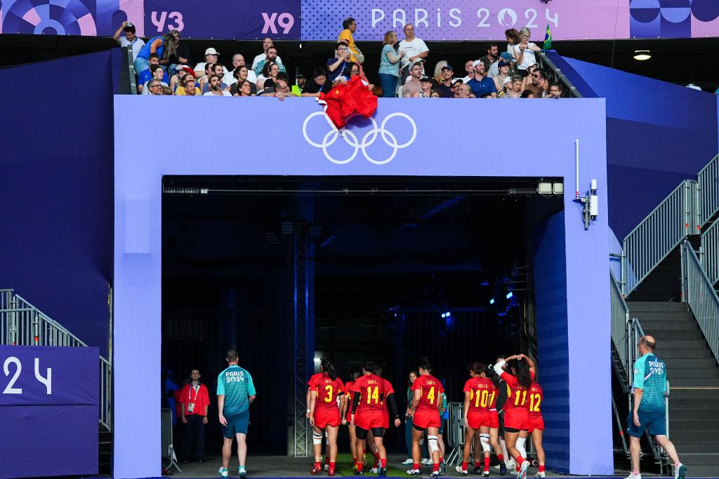 7月29日,中國隊選手劉瀟倩(右三)在賽後退場時向觀眾(zhong) “比心”。當日,在巴黎奧運會(hui) 七人製橄欖球女子四分之一決(jue) 賽中,中國隊5比55不敵新西蘭(lan) 隊。 新華社記者 許暢 攝